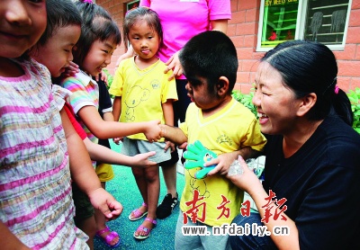 在數(shù)次聯(lián)系幼兒園遭拒后(本報(bào)7月23日曾作報(bào)道),“毛孩”文才昨日終于背上書包走進(jìn)梧桐山中英文幼兒園,開始了他在深圳的“上學(xué)夢(mèng)”。昨日,和同齡小朋友在一起玩,毛孩臉上洋溢著幸福的微笑。而他的雙胞胎弟弟因沒有受到資助入學(xué)而傷心流淚。“毛人”家族救助工程專家組組長田亞華表示,醫(yī)院“救命不救窮”,培養(yǎng)毛孩家族的自救意識(shí)對(duì)他們的心理矯正至關(guān)重要。