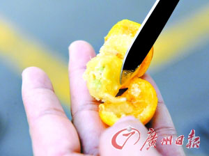 記者根據(jù)龔先生的引導(dǎo),在石溪南約東街附近懷疑有問題的水果檔花2.5元買了25個(gè)金橘,一個(gè)一個(gè)剝開來后,發(fā)現(xiàn)總共15個(gè)里頭是有蛆的。蛆蟲呈米色,只有不到1厘米長(zhǎng),大都藏在果肉里頭,打開果皮后還能看到它在蠕動(dòng)。有蛆的金橘摸上去都很軟,里頭的果肉組織往往被蟲蛀成一條條小通道。這種蛆金橘個(gè)頭比較小,有別于之前報(bào)道的曾發(fā)現(xiàn)蛆蟲的那種大柑橘。