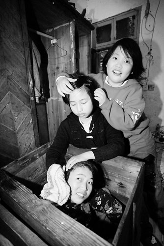 正對(duì)著門是一個(gè)長(zhǎng)一米、寬半米、高約90厘米的木頭箱子,曾之的姐姐竟然就坐在箱子里!“姐姐站不起來(lái),如果在床上或者別的地方就會(huì)亂爬,還會(huì)揀地上的臟東西吃,實(shí)在沒(méi)辦法只能讓她坐在這里面!痹呎f(shuō)邊幫姐姐理了理頭發(fā),與姐姐相比,曾之明顯瘦弱許多,臉色也比姐姐黃。