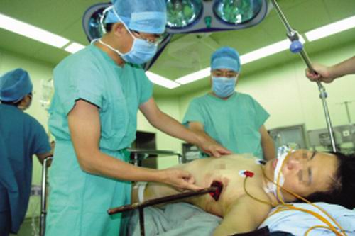 來到醫(yī)院后王女士已經(jīng)出現(xiàn)意識模糊,同時伴有劇烈的胸痛。胸外科主任張臨友教授和副主任徐廣全教授迅速組織相關(guān)科室人員會診,爭取快速摸清患者胸腔內(nèi)的情況和鋼筋對各器官造成的損傷。由于消防隊員在切割鋼筋時怕傷到王女士,所以切割點離傷口較遠(yuǎn),造成留在體外的鋼筋較長,傷者無法進(jìn)入CT拍攝影像,給診斷帶來了很大的困難。醫(yī)生只得為王女士進(jìn)行了胸部的X光片檢查。依靠豐富的臨床經(jīng)驗和X光片,醫(yī)生判斷王女士的肺組織已經(jīng)損傷,必須立即開胸探查。