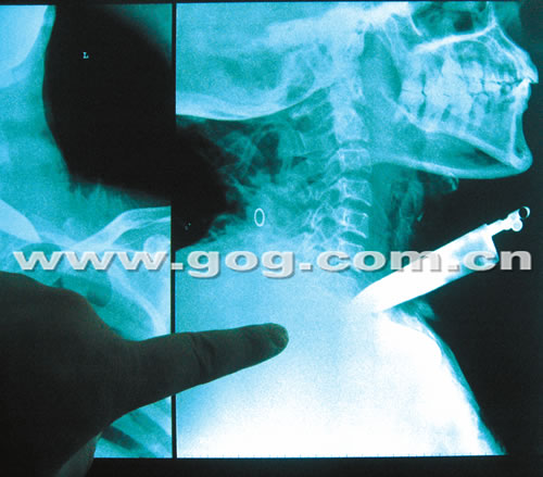 貴醫(yī)附院耳鼻喉科主治醫(yī)生王曉云告訴記者,老人被送到醫(yī)院時,喉嚨上插著一把水果刀,進(jìn)入喉嚨的刀鋒部分大約有6.5公分。王曉云說:“經(jīng)檢查,老人頸部和肺尖受傷,生命垂危。由于水果刀可能傷到大動脈,手術(shù)有風(fēng)險,要求家屬簽字,但老人一直不透露家人的信息,我們醫(yī)院也很為難!
