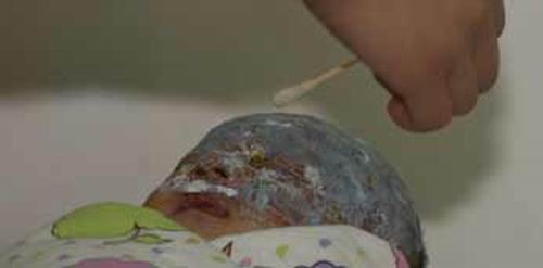 記者昨天(1月3日)在醫(yī)院見到了孩子,醫(yī)生把藥膏從孩子頭頂敷到孩子嘴唇上方,白白的一大片。孩子出現(xiàn)高燒,“醫(yī)生說(shuō)要過(guò)了7天感染期,才能知道孩子傷到啥程度,能不能留下疤痕!睏畹ふf(shuō)。