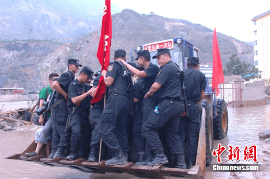 8月8日下午15時(shí),成都公安特警集結(jié)150人的隊(duì)伍從成綿高速成都入口處出發(fā),以摩托化開進(jìn)的方式,途經(jīng)成綿高速、綿廣高速出廣元昭化出口,上122國(guó)道經(jīng)青川、甘肅文縣、隴南市,經(jīng)過800公里連續(xù)18個(gè)小時(shí)的不間斷長(zhǎng)途跋涉,首批隊(duì)伍共計(jì)80人于9日上午8時(shí)15分到達(dá)災(zāi)區(qū)舟曲縣城。第二批隊(duì)伍于9日15時(shí)許到達(dá)舟曲。