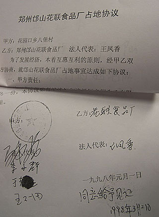 王鳳香出示了一張“土地承包合同”和一張“鄭州邙山花聯(lián)食品廠占地協(xié)議”。