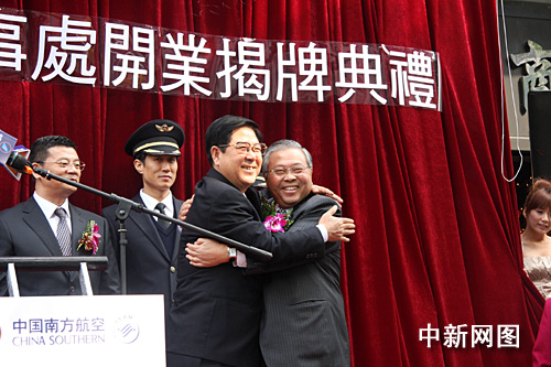 1月15日,大陸南方航空公司在臺(tái)北正式成立辦事處,成為首家在臺(tái)灣掛牌運(yùn)營(yíng)的大陸企業(yè)。圖為開(kāi)業(yè)揭幕儀式典禮上,南航董事長(zhǎng)司獻(xiàn)民(左一)與臺(tái)灣華航董事長(zhǎng)魏幸雄熱情擁抱。中新社記者 陳立宇 攝