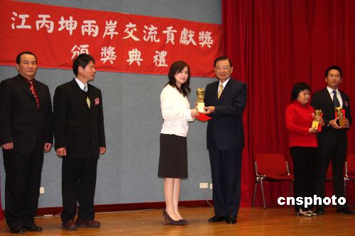 1月15日,;鶗麻L江丙坤出席“兩岸經(jīng)貿(mào)合作與交流研討會”,并頒發(fā)“江丙坤兩岸交流貢獻獎”。得主包括臺灣大學(xué)環(huán)境工程學(xué)研究所教授駱尚廉、夏潮基金會董事長宋東文等人。中新社發(fā) 陳立宇 攝