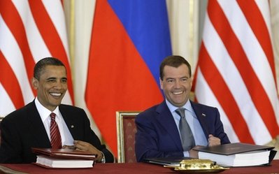 當地時間8日,俄羅斯總統(tǒng)梅德韋杰夫與美國總統(tǒng)奧巴馬在捷克首都布拉格城堡舉行會面,雙方進行了私人會談。中午,兩人在捷克總統(tǒng)府西班牙大廳舉行了隆重的削減進攻性戰(zhàn)略武器新條約簽署儀式。這被認為是俄美“重塑”兩國關系的關鍵之舉。