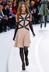 2008年Chanel的秋冬時裝秀場上,卡爾·拉格斐在秉承Coco Chanel“貧窮的奢華”的原則下,刻意給斜紋軟呢外套加上了抽線設(shè)計,拼接的碎布在手肘、口袋與短裙上隨處可見。不收邊的剪裁效果,充滿搖滾興味,戲劇化的荷葉邊、充滿立體感的打褶剪裁與布料上的紋路,成為Chanel本季的設(shè)計主軸。