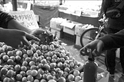 昨天,市民杜女士來到四道口明光寺批發(fā)市場的水果大廳購買橘子。她試吃了一家的橘子后感覺很甜,于是買了這家水果攤的橘子。但到家后她發(fā)現(xiàn),買來的橘子并不甜。一些常在該市場買水果的鄰居告訴了杜女士“水果刀的秘密”,隨后她再次返回該市場,親眼目睹了橘子“甜”的真正原因。昨天下午,記者來到四道口明光寺批發(fā)市場的水果大廳,見到一名攤主身邊有一個飲料瓶,飲料瓶在中間被挖掉一塊,瓶里裝著甜水。當(dāng)記者說要購買水果時,攤主主動從那只裝水的塑料瓶中取出水果刀,切開水果讓記者品嘗。記者趁機(jī)蘸嘗了塑料瓶中的水,果然很甜。