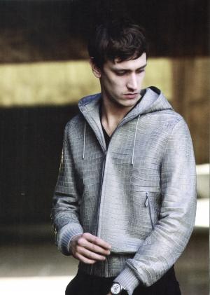 把厚重而奢華的鱷魚皮做成一件輕松休閑的連帽衫真是一個(gè)令人興奮的主意;疑茏岓w量輕巧起來,溫暖的絨布里子以及與針織面料的無(wú)縫縫合技術(shù),讓整件皮衣在細(xì)節(jié)上有了親和力。讓兩種不同的材質(zhì)沒有縫線、不見針腳地縫合在一起,沒有增添任何厚度,是愛馬仕秋冬男裝上的新看點(diǎn),由此而衍生了一些新面料:鱷魚斜紋織物、澤西水貂皮、薄紗貂皮……