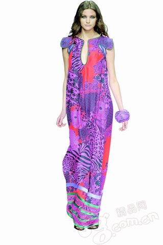 明艷的粉紅裙身上密布著斑馬紋、豹紋和各種部落圖案,傳達出強烈的異域民族風(fēng)情,長及腳踝的裙身惹人眼球,同色系的超大手鐲更有畫龍點睛之感。