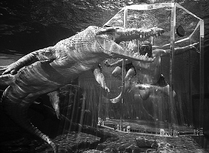 巨大的鱷魚似乎要給“死亡之籠”里的潛水者一個(gè)“擁抱”。