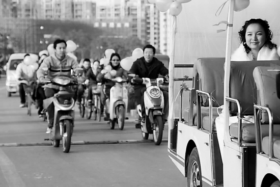 他們和學校聯(lián)系,花了60塊錢租來了學校里用來載學生和游客的觀光車作為婚車,又召集同門同學,準備了8輛自行車和4輛電瓶車。