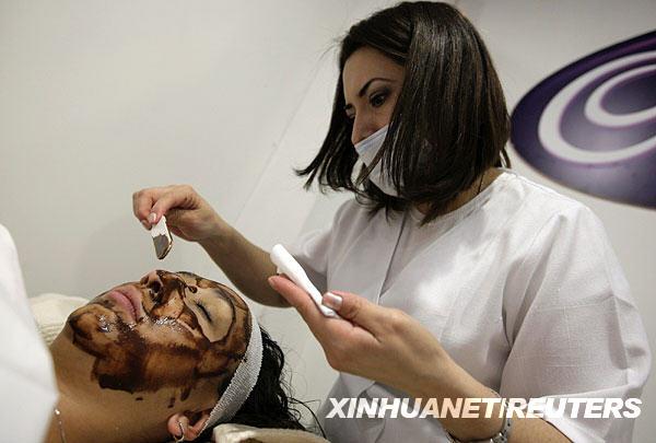 1月23日,在墨西哥首都墨西哥城舉辦的巧克力展覽上,工作人員用巧克力給一女子敷面膜。新華社/路透