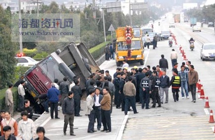 記者趕到現(xiàn)場(chǎng)時(shí),躺在路面上的受傷依姆和小女孩的遺體都已被轉(zhuǎn)移走。肇事的運(yùn)沙車側(cè)翻在路邊,車上沙子散落一地,左側(cè)車輪卡在路旁的排水溝里,動(dòng)彈不得。排水溝里,一輛三輪車扭成一團(tuán),死死卡在車子的下面。運(yùn)沙車的后面、地上滿是血跡,一輛從福清水南開往潯頭的中巴車停留在路旁,左側(cè)嚴(yán)重刮傷,兩面玻璃破碎,碎片散落一地。