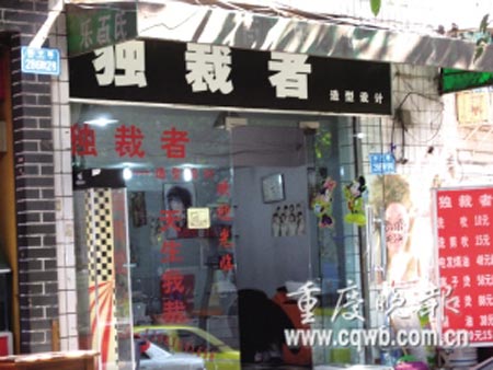 陳小姐所說的理發(fā)店位于渝中區(qū)七星崗和平路,是家面積約6平方米的小店,黑色招牌上,“獨(dú)裁者”三個白色大字特別顯眼。小店玻璃門上寫著“獨(dú)具匠心,天生我裁”。