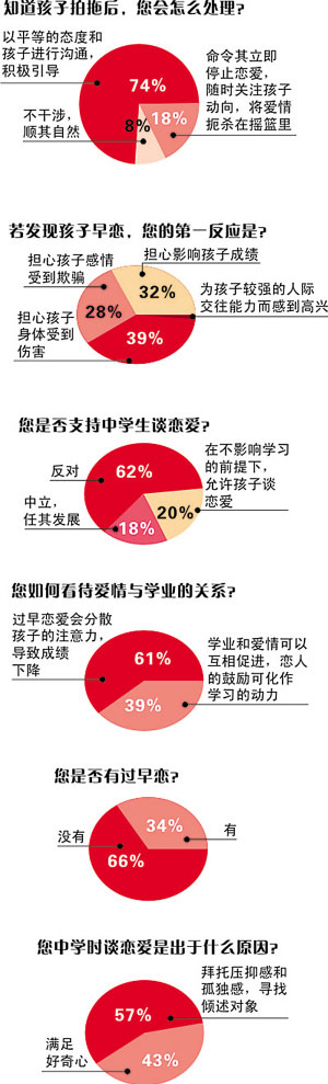 如果自己的孩子早戀,約七成人表示將以寬容理解的態(tài)度來處理。僅兩成受訪者表示,發(fā)現(xiàn)后會命令其立即停止戀愛,把愛情扼殺在搖籃中。另有一成人則表示“不干涉,順其自然”。記者 張淑敏