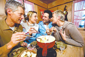 除了“奶酪火鍋”、“布吉尼奧納火鍋”外,瑞士常見的還有“巧克力火鍋”。這種火鍋是將巧克力搗成小塊,再放入少量淡奶油、甜酒(橘子酒、櫻桃酒)后用溫火慢慢攪拌并煮化巧克力,再放入諸如草莓、蘋果、香蕉、菠蘿等能切成塊的水果;吃時用長柄叉子叉著水果片,蘸著鍋中的巧克力汁一片一片地吃。覆蓋在水果表面的巧克力凝固后變得清脆爽口,甜甜蜜蜜,特別像北京冬天吃的糖葫蘆。冬天吃巧克力火鍋,可以抵御寒冷,又有浪漫情趣,因此最受青年戀人們的喜愛。