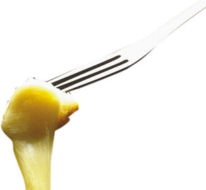 “奶酪火鍋”是瑞士最普遍、最具盛名的火鍋之一。瑞士人制作“奶酪火鍋”一般都是先以蒜涂抹于鍋底,再將不同口味的硬奶酪擦成碎末放入鍋中加熱成糊狀,再加淀粉、白葡萄酒、大蒜、奶油等,繼續(xù)煮并慢慢攪拌至完全融化呈濃濃的煉乳狀,最后放進一些黑胡椒即可。上桌后,人們用長柄叉子叉著切成四五厘米見方的“法式長棍面包”蘸著奶酪吃,很像中國的“拔絲香蕉”。此外,吃這種火鍋時,瑞士人還特別喜歡配上有助于清口的風干牛肉、腌酸黃瓜、小洋蔥。不過,吃這種火鍋一定要“點到為止”,雖然奶酪富于營養(yǎng),但很難消化,用白葡萄酒融化奶酪,就是為了幫助消化!