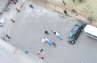 昨天,該校一名現(xiàn)場目擊者陳姓學(xué)生透露,先聽到有一男一女的爭吵聲,接著聽到一個女生的嘶喊聲,后來就看到一女一男先后從公寓樓墜下。當(dāng)天下午6:40左右,北京朝陽警方迅速封鎖現(xiàn)場,展開調(diào)查。另一目擊者說,當(dāng)晚6:20,一名女生從靜思苑13層?xùn)|南側(cè)樓梯窗口墜下,5分鐘后男生從同一位置墜下。墜樓后,兩人橫躺在宿舍樓南側(cè)的地面上,女生穿粉紅色睡衣,男生光著上身,下身穿牛仔褲,身下有大片血跡。原來,兩人墜樓的窗臺高約1米,窗戶面積不足1平方米,窗戶的紗窗已被撕開,一件藍(lán)色運(yùn)動上衣還留在窗臺上,附近地面上還有數(shù)根煙頭,該樓一層?xùn)|側(cè)入口處的欄桿也被砸斷!