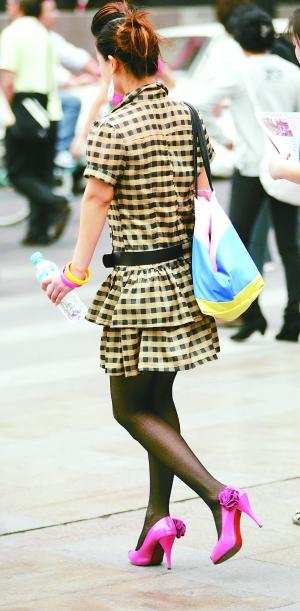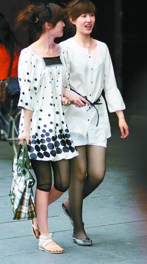及膝短裙或牛仔短褲,配上黑色長筒絲襪和一雙平底鞋,這是今夏北京街頭最I(lǐng)N的搭配打扮。黑色絲襪,在沉寂了多年之后,又重新受到時(shí)尚達(dá)人的追捧。