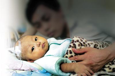 昨日,在兒童醫(yī)院內(nèi)科住院部的病床上,5個月大的周舟頭上插著輸液管,小臉蠟黃。當(dāng)記者伸過手去,她居然拉著記者的手不肯松開,模樣惹人憐愛。