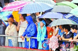 雖然昨天的賽事從頭到尾都在下雨,但這絲毫沒(méi)有影響人們的熱情,記者看到,整個(gè)聚龍村以及河堤的道路兩旁,均停放著大量的車(chē)輛,而在河堤上,更是人山人海,人們打著雨傘狂呼,給各自村的隊(duì)伍加油。而在河對(duì)岸的芳村海北村,也與聚龍村的河堤上一樣精彩,隔河相望,相互加油。