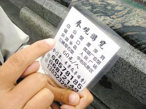 “一日游,60塊錢。馬上就可以走!币幻麐D女湊上來,還揚起手中的一張紙片,上面印有參觀行程:白公館、渣滓洞、磁器口或湖廣會館、環(huán)游半島、人民廣場、三峽奇石館、華巖風(fēng)景區(qū)(含門票、車費、導(dǎo)游費)。