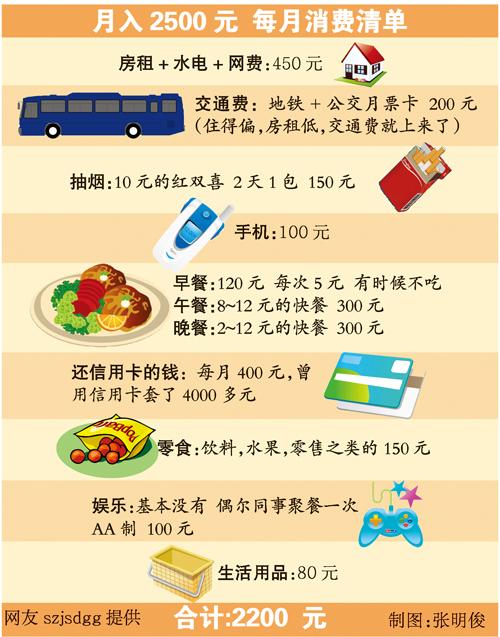 近日,一名剛剛踏入職場(chǎng)的年輕白領(lǐng)szjsdgg在大洋網(wǎng)上稱自己“月薪2500元在廣州的生活”:大學(xué)畢業(yè)1年半,工作1年多,現(xiàn)在在廣州拿著2500元左右的月薪,剛夠基本生活開銷,只剩下300元。