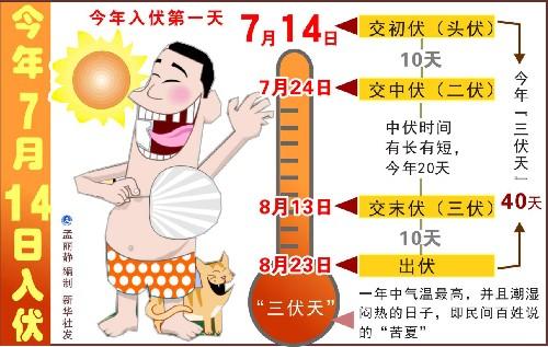 據(jù)了解,從夏至日開始算起,第3個“庚日”即為入伏,第4個“庚日”為“中伏”;從立秋開始算起的第1個“庚日”為“末伏”的始日,第2個“庚日”定為出伏,“三伏天”才宣告結(jié)束。