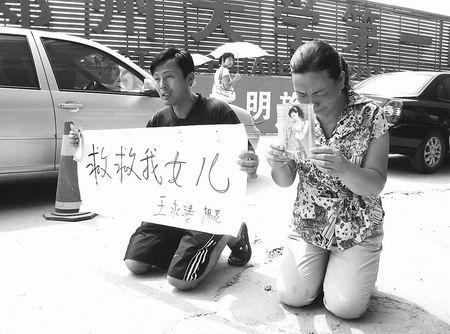 記者迅速趕到鄭州大學第一附屬醫(yī)院門口,在人行道上,跪著一對年齡在46歲左右的男女,他們舉著一張白紙,上面寫著“救救我女兒”的字樣,下面寫著他們兩人的名字王永濤和楊花!澳銈?yōu)槭裁催@樣做呢?”記者問,聽到記者的問話,兩人同時流下了淚水,他們拿出了多張女兒的照片:“那是孩子去年照的,現(xiàn)在孩子已變了個樣子!”記者看到,他們的女兒王曉燕清純漂亮,笑容里充滿著對未來人生美好的憧憬。