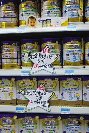 但昨天在一些商場看到的惠氏促銷廣告上赫然標(biāo)注著:“購買900克的三聽,送400克的一盒。”黃女士跟記者算這筆賬:“一聽金裝幼兒樂第三階段奶粉漲了17元,如果買三盒,就等于貴了51元,但贈送一盒400克裝的,價值56元(漲價前),算起來,等于沒漲價。只是要多買幾瓶罷了。但現(xiàn)在是夏天,也不知道奶粉多買了能不能保存!