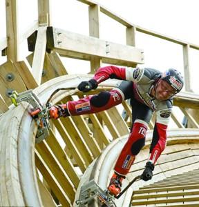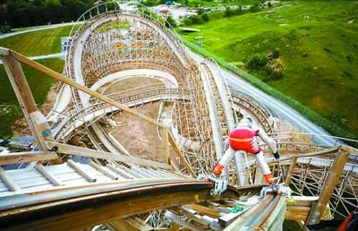 別看Dirk在過山車上 “風馳電掣”,十分風光,其實他冒著巨大的風險。當Dirk完成滑行后,他才長舒一口氣。由于這次滑行的過山車是全木制的,都由釘子固定,在高速滑行的過程中,任何一個突出的釘子都會使他喪命。不過Dirk絲毫不介意所承擔的風險,對他來說,這才是冒險的樂趣所在。
