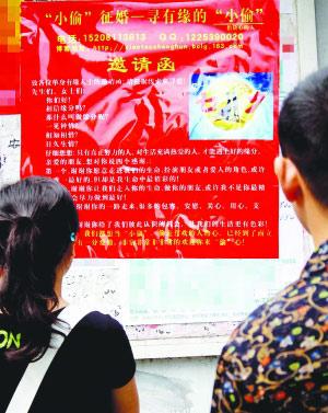 這張大紅海報十分喜慶,上貼一張七夕圓月牛郎織女相會圖,留下征婚者的電話號碼、QQ號碼及網(wǎng)絡(luò)博客地址,另有一些真情話語。乍一看,這“小偷”征婚還真蒙混人,可走近一瞧,才發(fā)現(xiàn)標題上的“小偷”下面有五個小字注釋:指偷心的人。