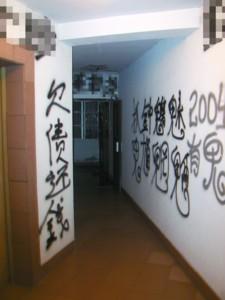 昨晚,記者在該樓20層看到,雪白的墻面上幾乎被黑漆涂滿了字。居民走出電梯或家門,映入眼簾的便是“殺”、“死”、“此屋有鬼”、“欠債還錢”之類的大字。2004室的鐵皮防盜門已被砸得嚴(yán)重變形,門鎖上方有一個(gè)碗大的窟窿。透過窟窿,記者發(fā)現(xiàn)里面似乎已多時(shí)沒有人住了。
