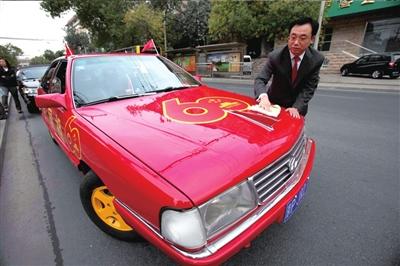 上午9點(diǎn),一個(gè)由7輛轎車組成的婚禮車隊(duì)駛過天安門,婚車上的小國(guó)旗迎風(fēng)招展。最引人注目的是該車隊(duì)的頭車,它是一輛鮮紅色的紅旗轎車。車身四周都裝飾著國(guó)慶60周年的標(biāo)志,兩側(cè)寫著“祖國(guó)母親生日快樂”、“祖國(guó)我愛你”等愛國(guó)標(biāo)語(yǔ),分外醒目。過往的行人看見此景,十分好奇,紛紛駐足觀看。
