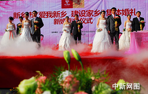 中新網(wǎng)新鄉(xiāng)11月22日 (記者 史寶銀 向明超)11月22日上午,由新鄉(xiāng)市文明辦、共青團(tuán)新鄉(xiāng)市委、新鄉(xiāng)市婦女聯(lián)合共同主辦的“愛我新鄉(xiāng)、建設(shè)家鄉(xiāng)”集體婚禮在新鄉(xiāng)市人民公園東門廣場(chǎng)隆重舉行。慶典儀式上,新郎新娘紛紛捐出了自己的禮金,購(gòu)買了5000枚石榴花圖案的新鄉(xiāng)市徽向市民免費(fèi)發(fā)放,同時(shí)倡議市民熱愛家鄉(xiāng),建設(shè)家鄉(xiāng)。