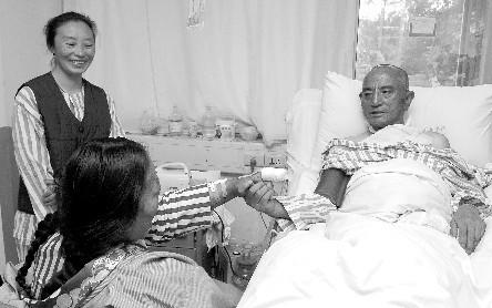 昨日下午3時11分,省醫(yī)院ICU。醫(yī)護人員聽說代吉卓瑪專門來看望丈夫昂文根德時,趕緊幫忙打開ICU的玻璃門。根德聽說妻子從華西醫(yī)院過來看他,坐在病床上急切地向門口張望!艾F(xiàn)在感覺怎么樣?好多了吧?”輪椅上的卓瑪來到病床邊,緊緊地抓住丈夫的手輕聲問道?吹蕉嗳瘴匆姷钠拮,根德黝黑的臉上笑容燦爛。指指自己的喉嚨,豎起大拇指,又拼命地點頭。因為剛剛做過手術(shù),根德尚不能說話,他只能通過肢體語言告訴妻子,他很好。
