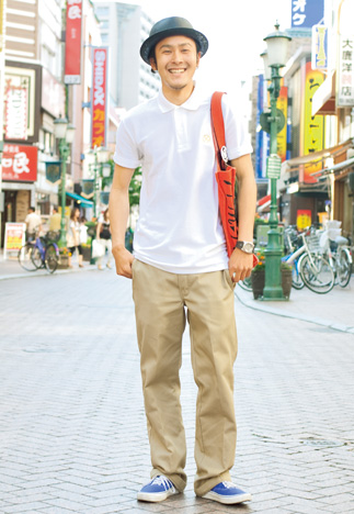 依舊是單色組合。在日本的街頭,這種隨意休閑的造型組合非常多見(jiàn)。卡其色的褲子,搭配任意一款單色上衣,只需要加個(gè)禮帽,或者背個(gè)包包,這就完成了一個(gè)型男出街的日常標(biāo)準(zhǔn)款。很簡(jiǎn)單吧?!