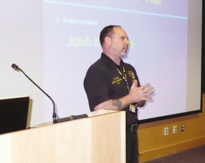 舊金山加大犯罪分析專家John Racine現場介紹安全常識,比如“雙肩背書包不可單肩背”,并當場扮演歹人如何能輕而易舉搶走學生肩頭的背包。在街頭行走時要顯示自信心,萬一感覺有人尾隨時,可以采取穿越馬路和到鄰近商店求助報警的方式來保護自己。(劉海平)