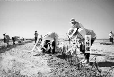 此次活動的主要任務(wù)是植沙障。原來,當(dāng)?shù)胤乐紊郴饕欠N植了一種叫做堿蓬的植物,為了防止大風(fēng)吹走堿蓬的種子,就將折斷的枯樹枝一排排整齊地插在土里,也就是沙障了。