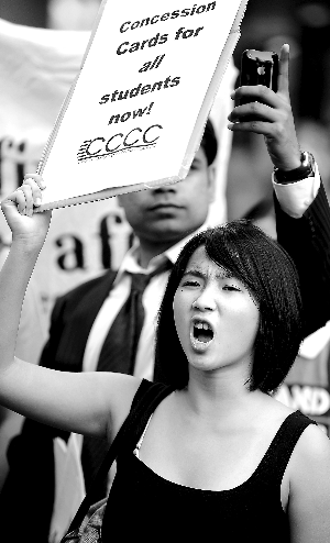 9月2日,來自中國、印度等10多個國家的近千名外國留學生聚集在澳大利亞悉尼科技大學門前,開始了他們?yōu)闋幦『戏嘁娑e行的大游行。游行的直接原因是交通優(yōu)惠卡問題———在留學生最多的新南威爾士州和維多利亞州,只有澳大利亞本地學生才能獲得交通優(yōu)惠卡,享受乘坐汽車、火車5折的待遇。但是,留學生們的不滿并不是小小的優(yōu)惠卡這么簡單。