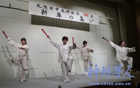 宴會(huì)中舉辦方為大家精心準(zhǔn)備的日本舞蹈——千葉玉枝博得了來賓們的陣陣掌聲與由衷贊賞。札幌太極拳協(xié)會(huì)隨后的太極梅花扇表演更是把整個(gè)宴會(huì)推向了一個(gè)高潮。來自中國的各界朋友對(duì)日本友人的認(rèn)真表演和對(duì)中國文化的宣揚(yáng)表示了由衷的贊賞與謝意。
