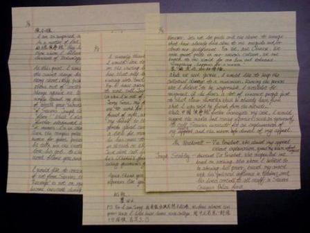 “…此時(shí)此刻,我希望專心于洗脫目前我被指控的罪名。長(zhǎng)故事短說,他們(校方)將我的電話上的講話斷章取義,指控我“恐怖威脅” (他寫terrorist threat 而非檢方指控的terroristic threat) 。當(dāng)我問他們(校方)原因時(shí),史蒂文斯(技術(shù)學(xué)院)回避我的問題只是回答我“你應(yīng)該小心你的嘴”。之后,史蒂文斯(技術(shù)學(xué)院)學(xué)生發(fā)展部助理副總史德利(Joseph Stahley) 更回應(yīng)說“我有主導(dǎo)權(quán)! (I have the floor)”!爱(dāng)時(shí)我不明白(他指什么),他接著解釋說,這是一句美國(guó)俚語,意思是現(xiàn)在是我負(fù)責(zé)!…”