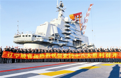中新網(wǎng)11月8日電 據(jù)中國軍網(wǎng)海軍頻道報(bào)道,11月7日,我軍首艘航母、海軍“遼寧艦”上千名官兵展開鮮紅的彩色條幅,高聲歡呼,歡慶黨的十八大勝利召開。
