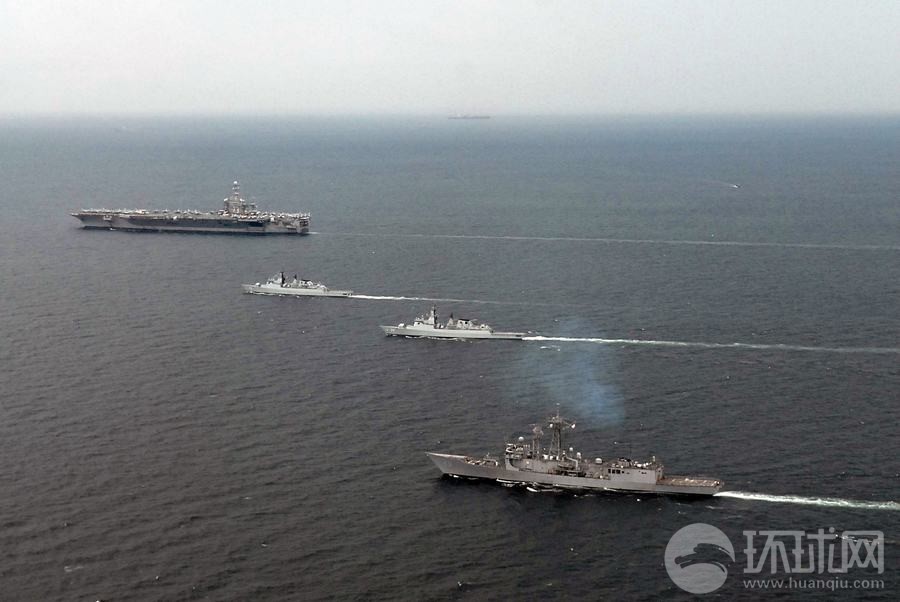 馬來西亞海軍戰(zhàn)艦與美軍華盛頓號(hào)航母組成編隊(duì)航行