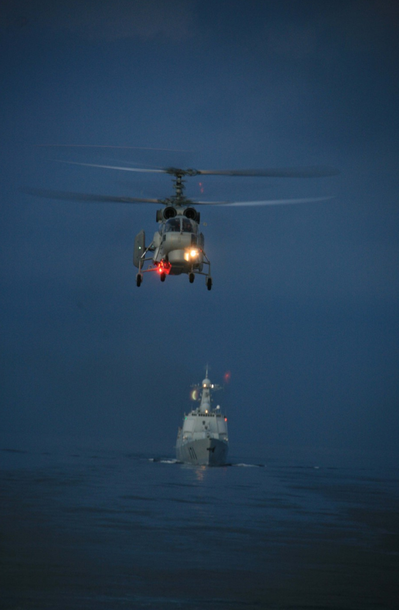2008年12月28日夜,中國赴亞丁灣、索馬里海域護(hù)航編隊(duì)組織夜間直升機(jī)行進(jìn)間著艦訓(xùn)練。越來越多的中國軍人,正在以各種方式走出國門,走上國際舞臺(tái)。聯(lián)合國維和、國際人道主義救援、海外護(hù)航、中外軍隊(duì)聯(lián)演聯(lián)訓(xùn)、軍事友好訪問,處處展現(xiàn)出和平之師的良好形象。2008年12月26日,中國海軍艦艇編隊(duì)首次遠(yuǎn)赴亞丁灣、索馬里海域,為過往商船護(hù)航。截至2012年7月,先后有12批護(hù)航編隊(duì)參加護(hù)航任務(wù),安全護(hù)送474批共4727艘中外船舶。新華社發(fā)