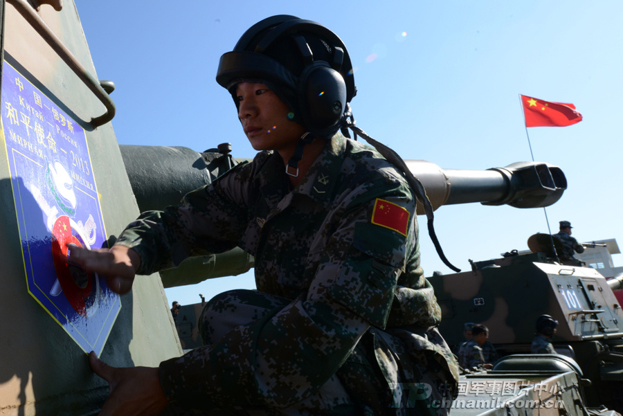 一名戰(zhàn)士給將要出征的戰(zhàn)車貼上演習圖標