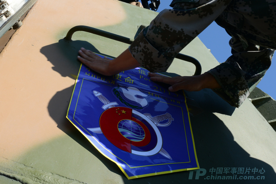 一名戰(zhàn)士給將要出征的戰(zhàn)車貼上演習(xí)圖標(biāo)