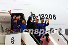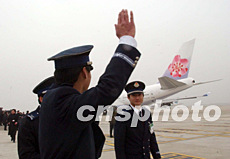 載有春節(jié)返鄉(xiāng)探親臺商及其眷屬的臺灣“華航”包機,一月二十六日上午十一時三十分左右從上海浦東機場順利起飛。圖為“華航”機組人員起飛前揮手作別。